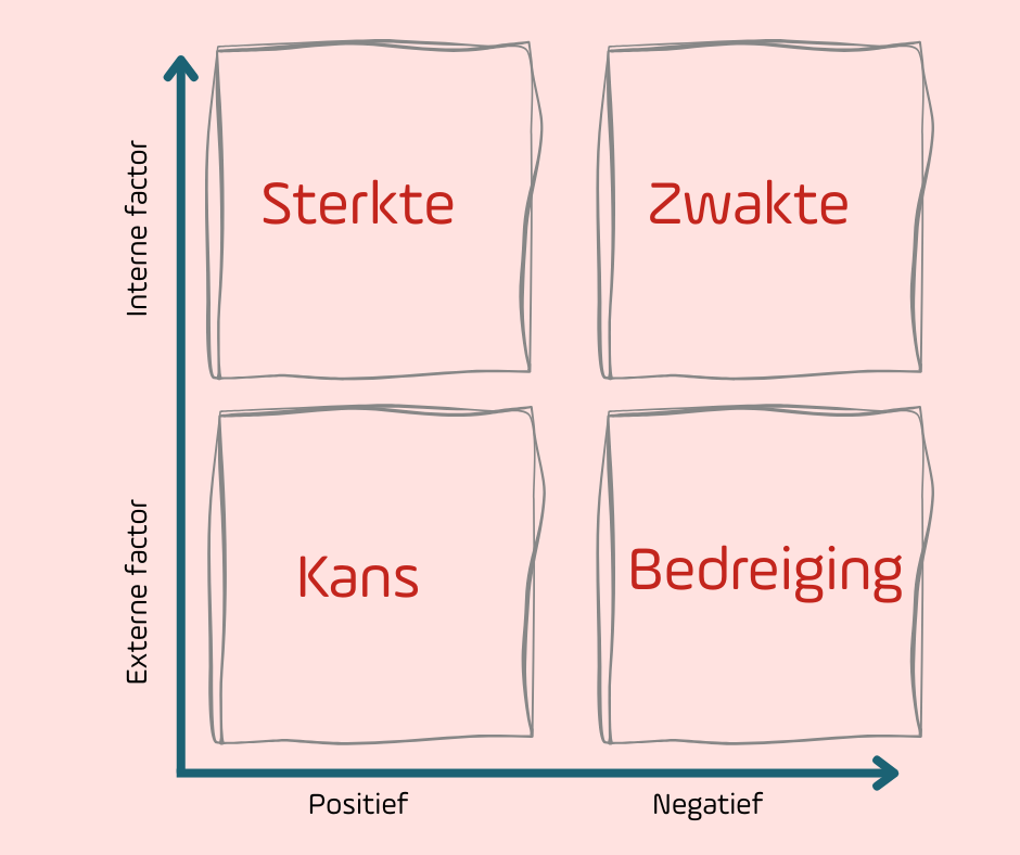 Een veelgebruikte methode om de interne en externe analyses uit te voeren is aan de hand van een SWOT-analyse. SWOT staat voor Strengths (sterktes), Weaknesses (zwaktes), opportunities (kansen) en threats (bedreigingen). Deze categorieën worden schematisch voorgesteld aan de hand van twee assen.